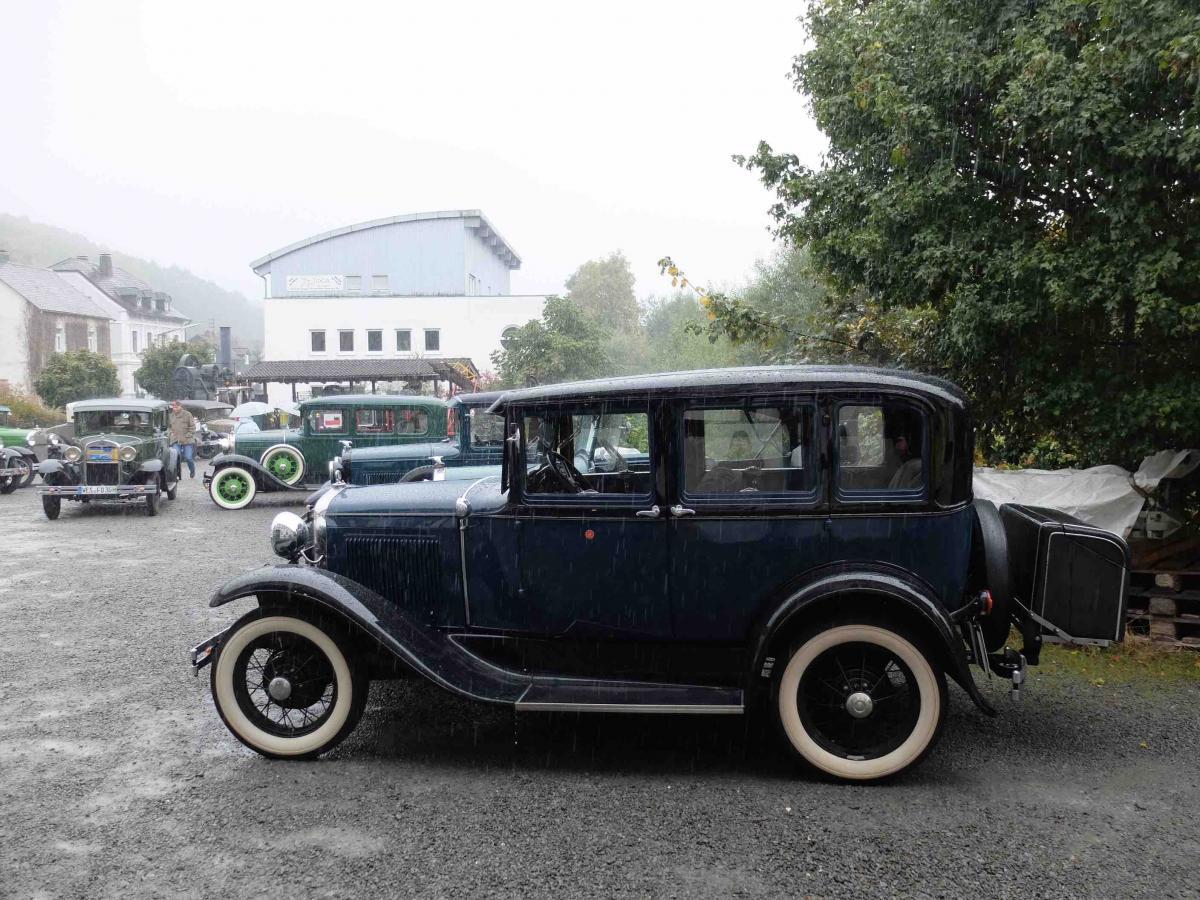 Strömender Regen und heftiger Sturm begleitete das große 1. große Ford Model A Classic Meeting am 23. September 2018 im und am das Technikmuseum Freudenberg. Wer nun jedoch glaubt, die Veranstaltung sei damit ins Wasser gefallen der irrt. Gut dreißig der ursprünglich 50 angemeldeten Ford Model A Oldtimer fanden den Weg nach Freudenberg und bescherten nicht nur den Museumsverantwortlichen, sondern auch den knapp 800 Besuchern einen besonderen Tag inmitten vorzüglich restaurierten alten Blechs. Und das ist positiv zu verstehen. Kurzerhand hatten die Museumsmacher aus Freudenberg in Kooperation mit der Ford Model A Interessengemeinschaft die große Maschinenhalle des Museums soweit möglich ausgeräumt um den offenen Fahrzeugen einen trockenen Standplatz zu sichern.